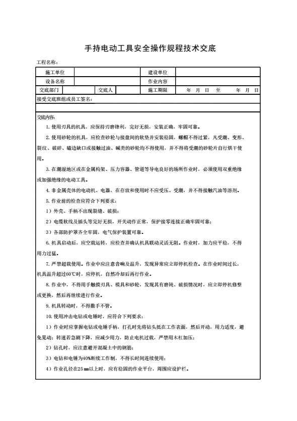 表格名称:手持电动工具安全操作规程技术交底