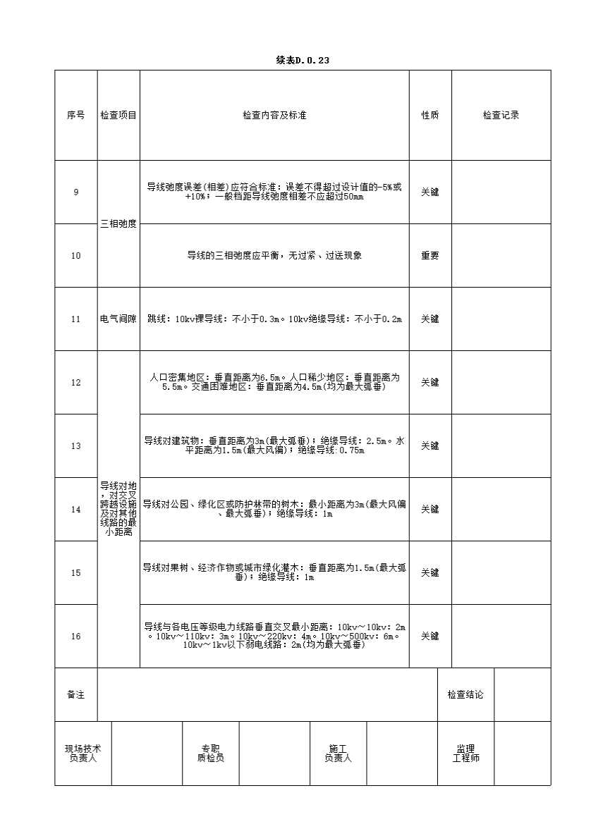 表格名称:表D.0.23 10kV线路导线架设检查记录表