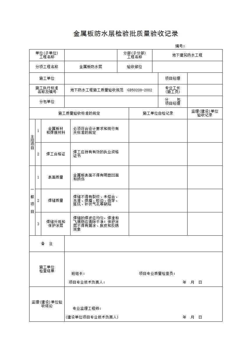 金属板防水层检验批质量验收记录