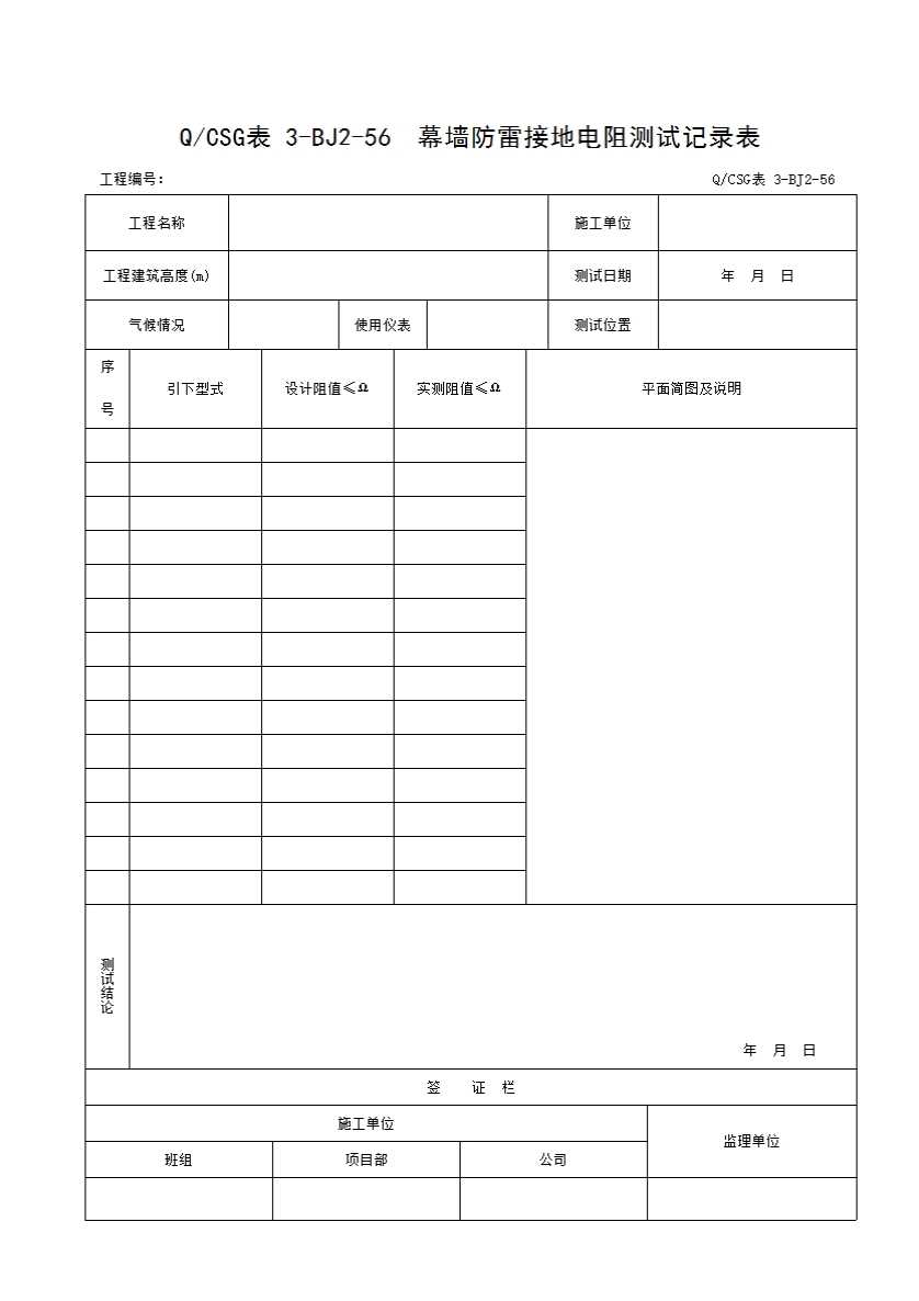 表格名称:QCSG 表 3-BJ2-56 幕墙防雷接地电阻测试记录表