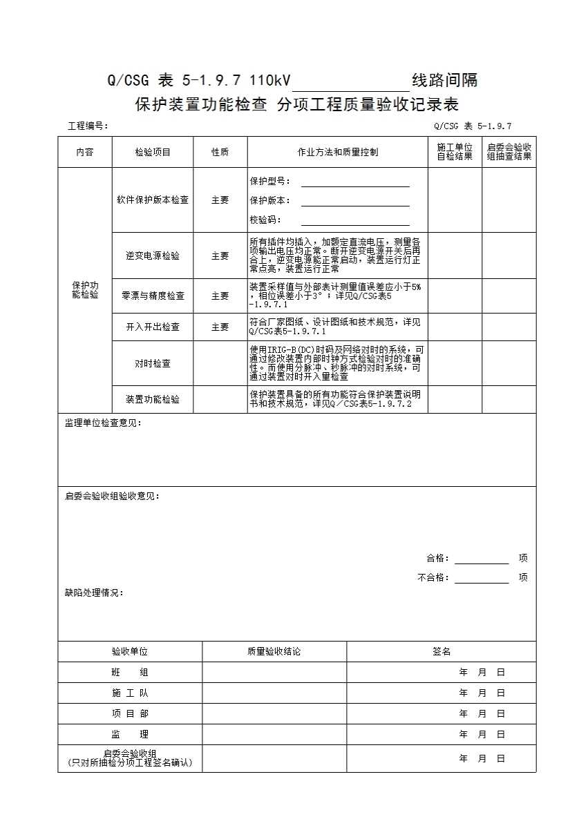 QCSG 表 5-1.9.7 110kV______线路间隔保护装置功能检查 分项工程质量验收记录表
