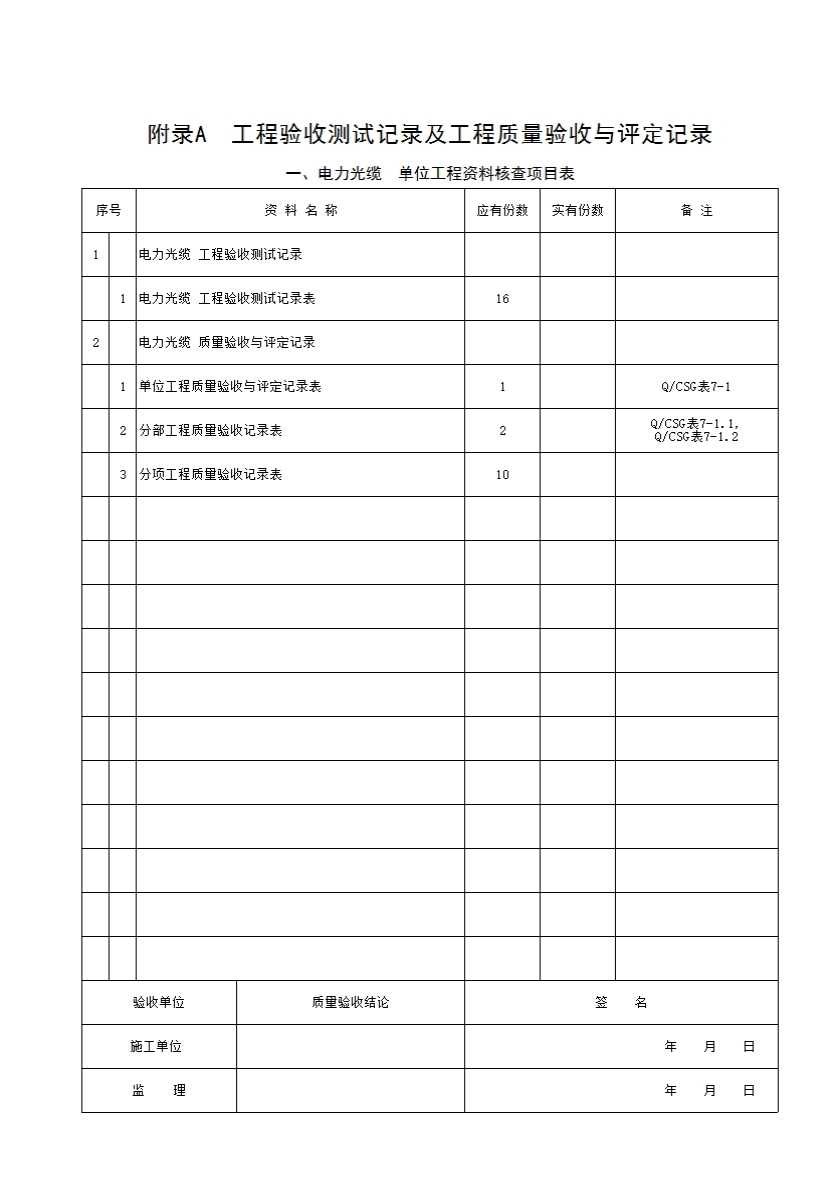 表格名称:一、电力光缆 单位工程资料核查项目表