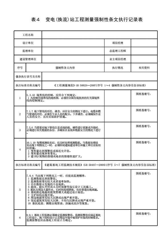 表格名称:表4 变电(换流)站工程测量强制性条文执行记录表