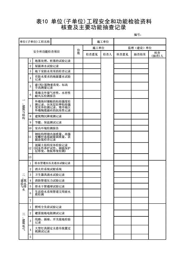 表格名称:表10 单位(子单位)工程安全和功能检验资料核查及主要功能抽查记录