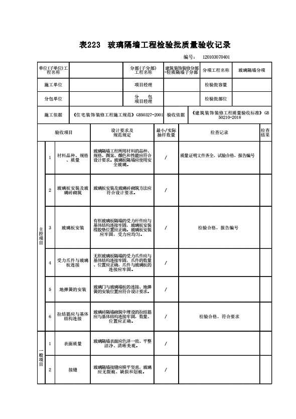 120103070401 玻璃隔墙工程检验批质量验收记录