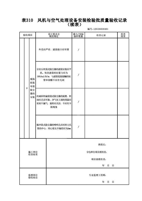 表格名称:120106030401 风机与空气处理设备安装检验批质量验收记录