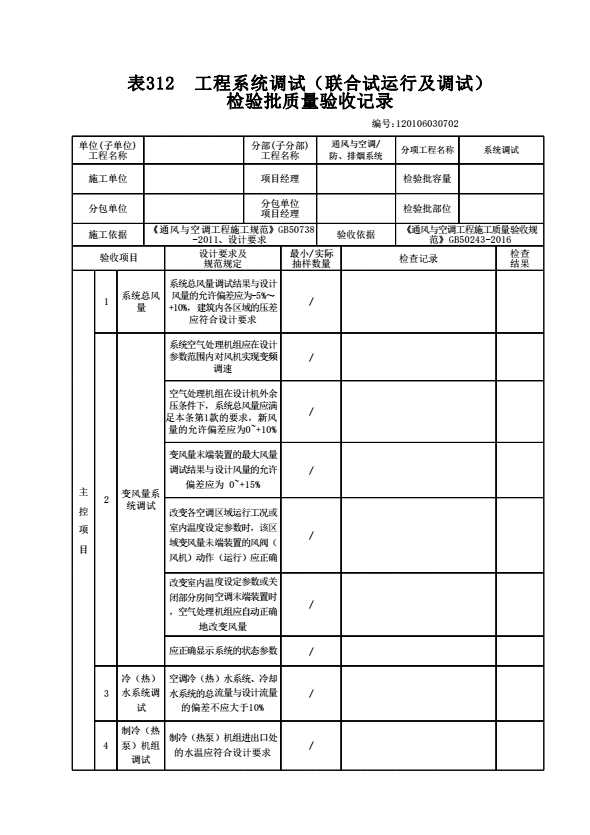 表格名称:120106030702 工程系统调试(联合试运行及调试)检验批质量验收记录