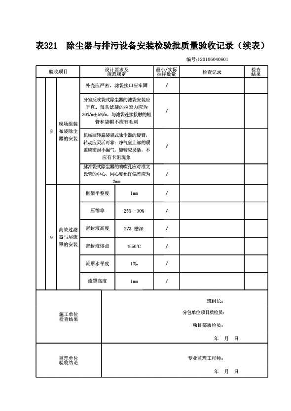 表格名称:120106040601 除尘器与排污设备安装检验批质量验收记录