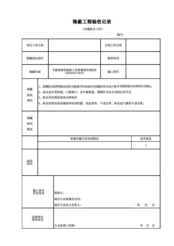 表格名称:隐蔽工程验收记录(涂膜防水工程)