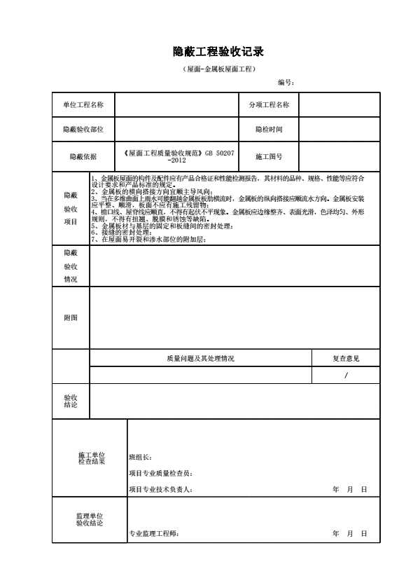 表格名称:隐蔽工程验收记录(屋面-金属板屋面工程).