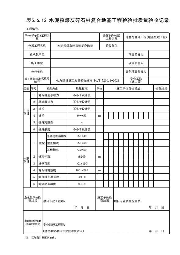 表格名称:表5.6.12 水泥粉煤灰碎石桩复合地基工程检验批质量验收记录