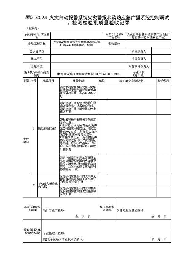 表格名称:表5.40.64 火灾自动报警系统火灾警报和消防应急广播系统控制调试、检测检验批质量验收记录