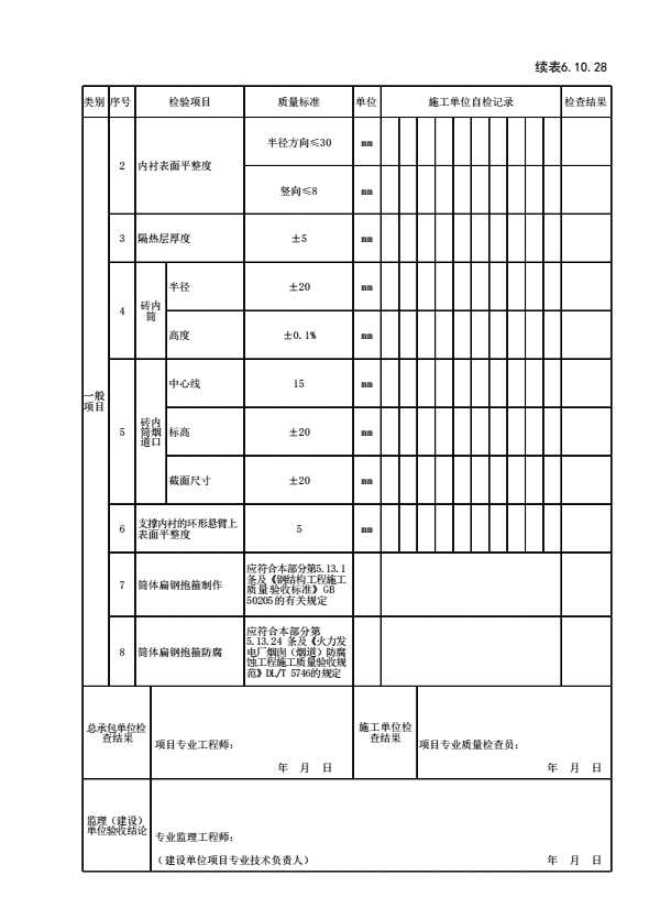 表格名称:[符合表6.10.28]表6.10. 57水平内接烟道( 砖混结构)的内衬彻筑工程检验批质量验收记录