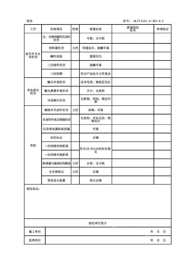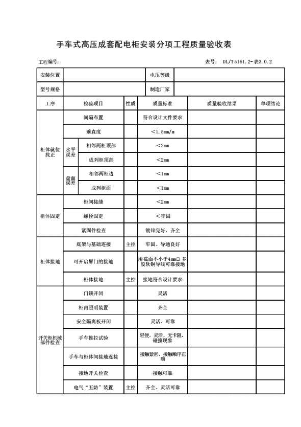 表格名称:表3.0.2 手车式高压成套配电柜安装分项工程质量验收表