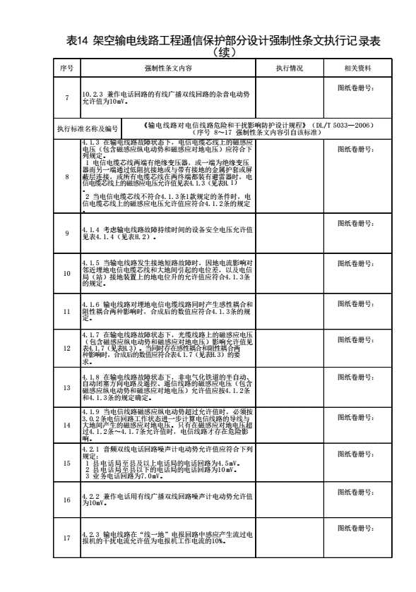 表格名称:表14 架空输电线路工程通信保护部分设计强制性条文执行记录表