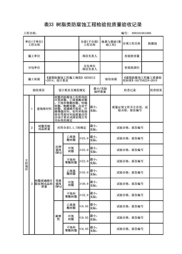 表格名称:090101061006 树脂类防腐蚀工程检验批质量验收记录