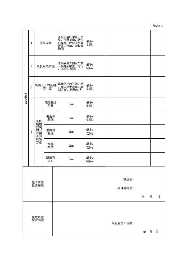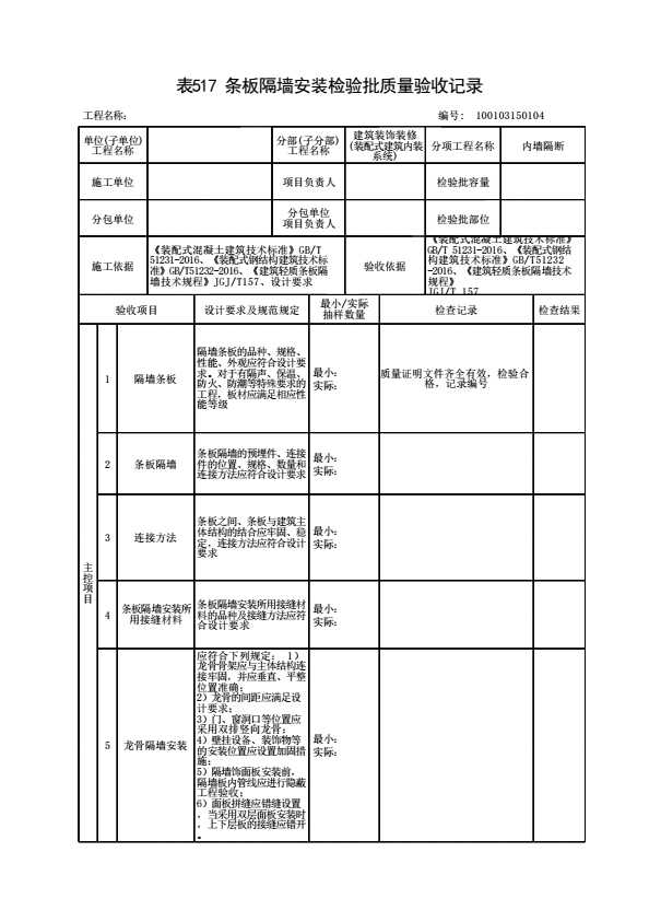 表格名称:100103150104 条板隔墙安装检验批质量验收记录