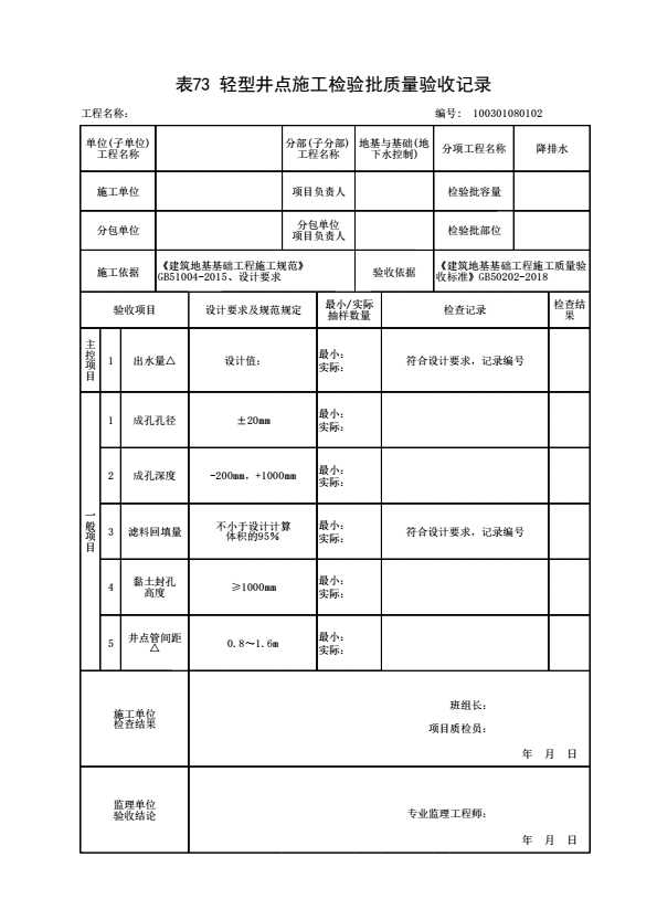 表格名称:100301080102 轻型井点施工检验批质量验收记录
