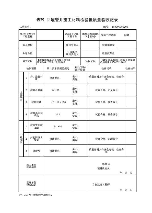 表格名称:150301080201 回灌管井施工材料检验批质量验收记录