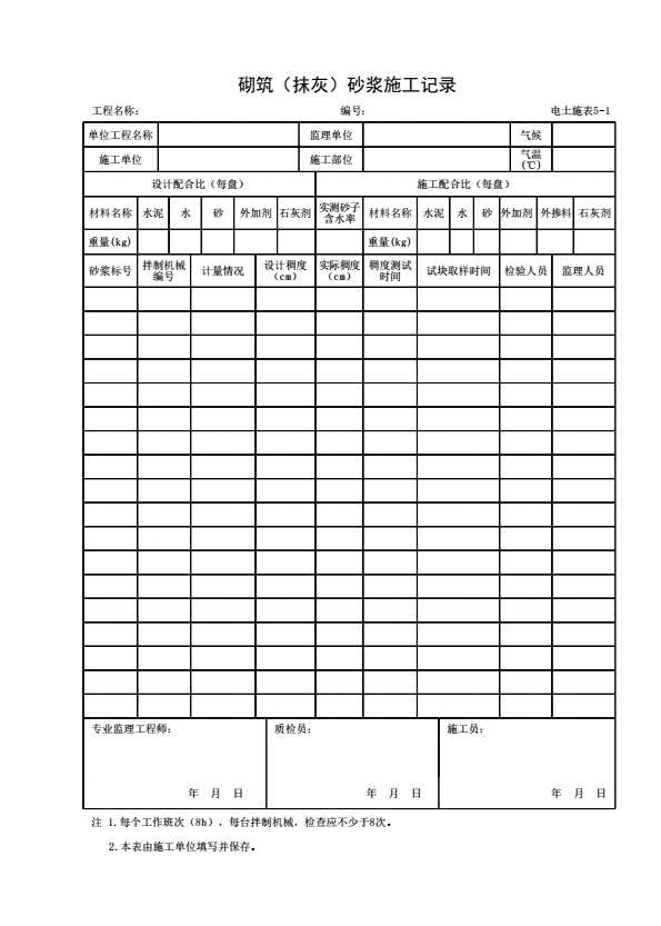 表格名称:电土施表5-1 砌筑(抹灰)砂浆施工记录