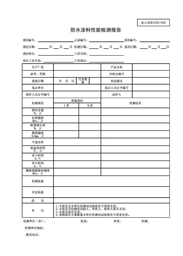 表格名称:电土试表JCBG-022 防水涂料性能检测报告