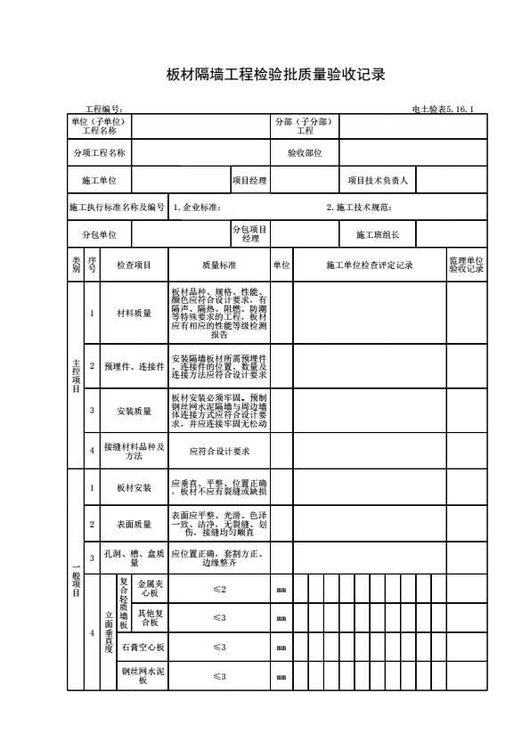 表格名称:电土验表5.16.1 板材隔墙工程检验批质量验收记录