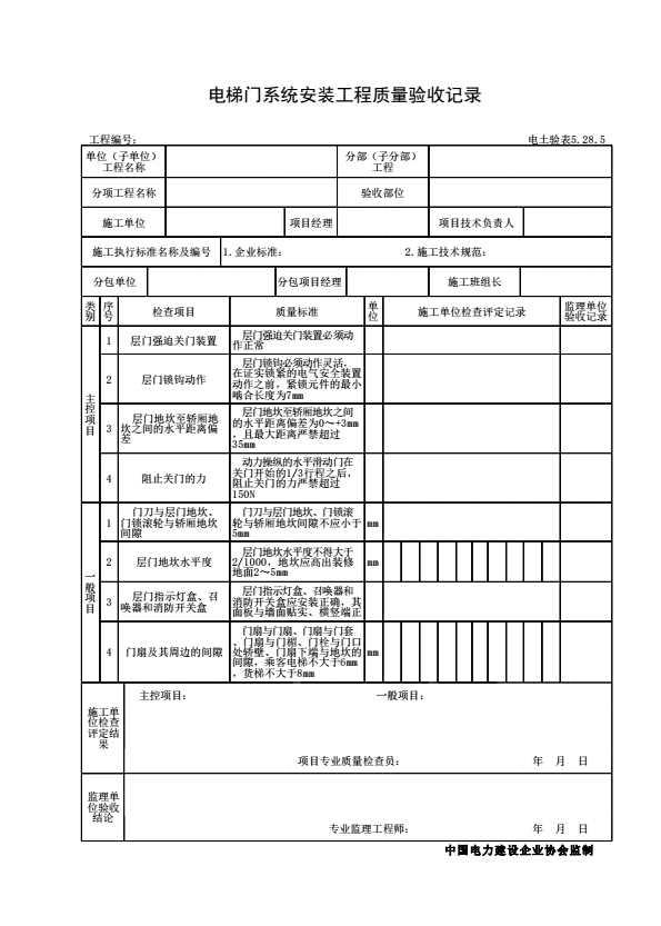 表格名称:电土验表5.28.5 电梯门系统安装工程质量验收记录