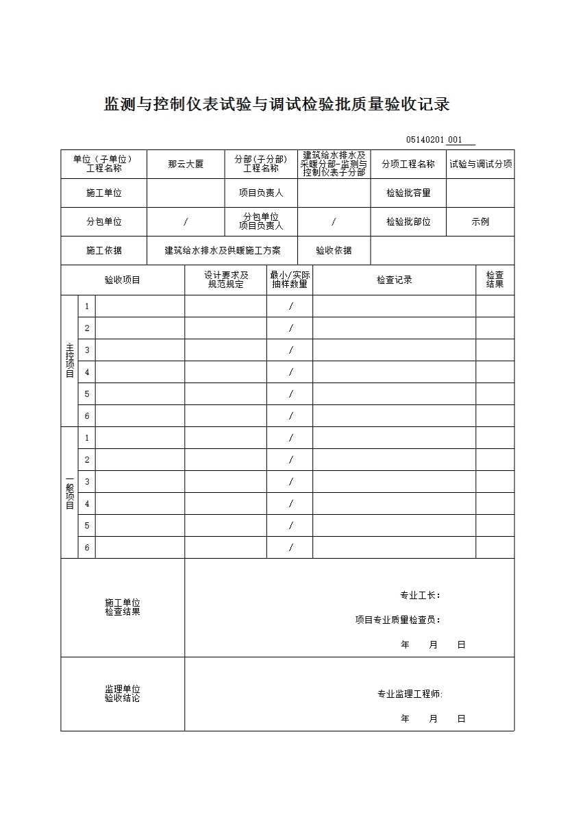 表格名称:05140201_监测与控制仪表试验与调试检验批质量验收记录