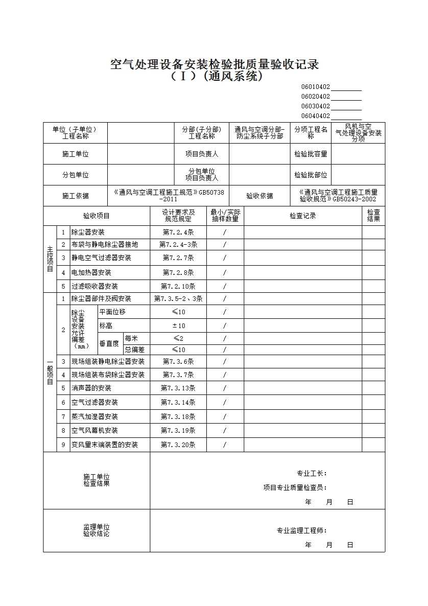 06040402_空气处理设备安装检验批质量验收记录(Ⅰ)(通风系统)