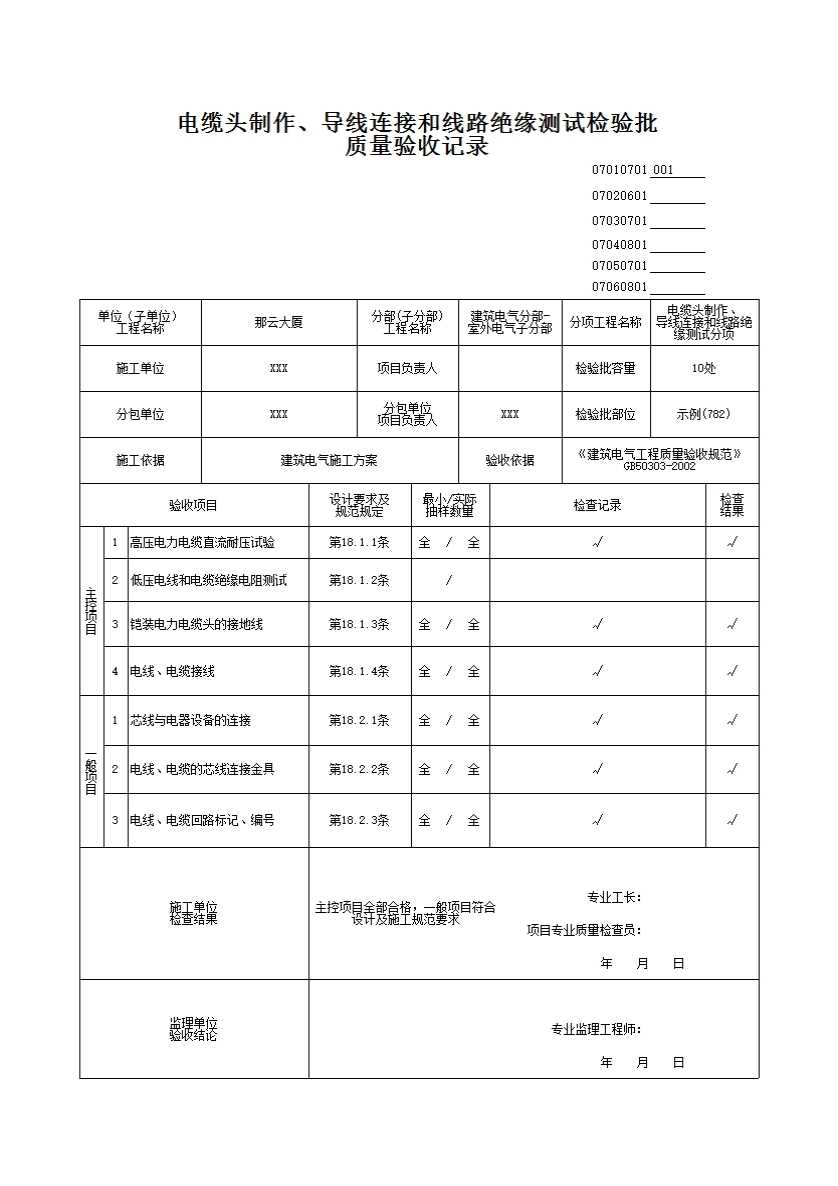 07010701_电缆头制作、导线连接和线路绝缘测试检验批质量验收记录
