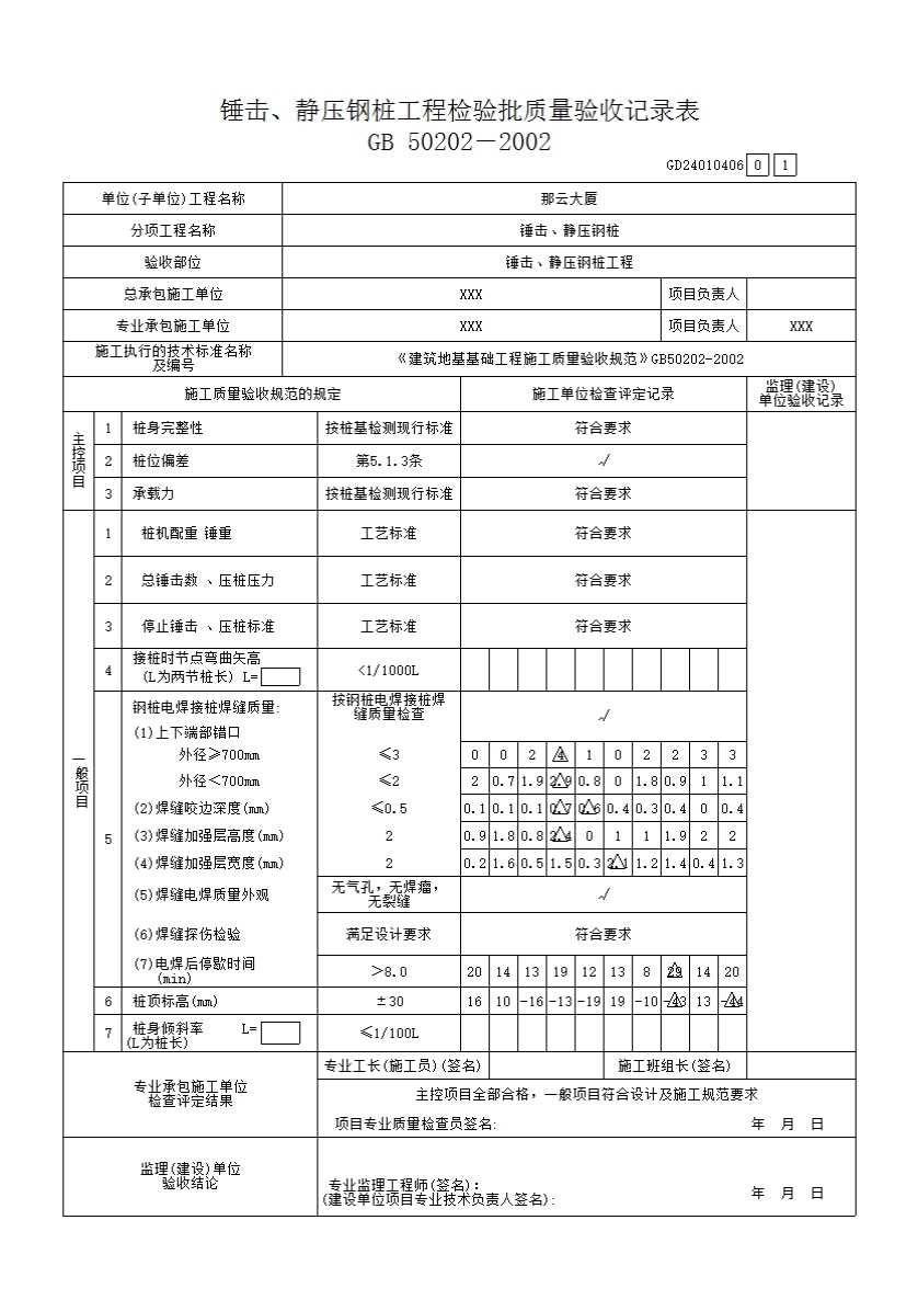 表格名称:锤击、静压钢桩工程检验批质量验收记录表GD24010406