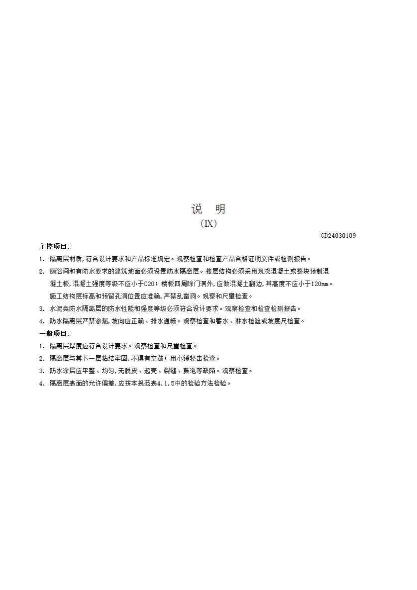 3.0.22 建筑地面工程的分项工程施工质量检验的主控项目,应达到本规范规定的质量标准,认定为合格;一般项目80%以上的检查点(处)符合本规范规定的质量要求,其他检查点(处)不得有明显影响使用,且最大偏差值不超过允许偏差值的50%为合格。隔离层检验批质量验收记录