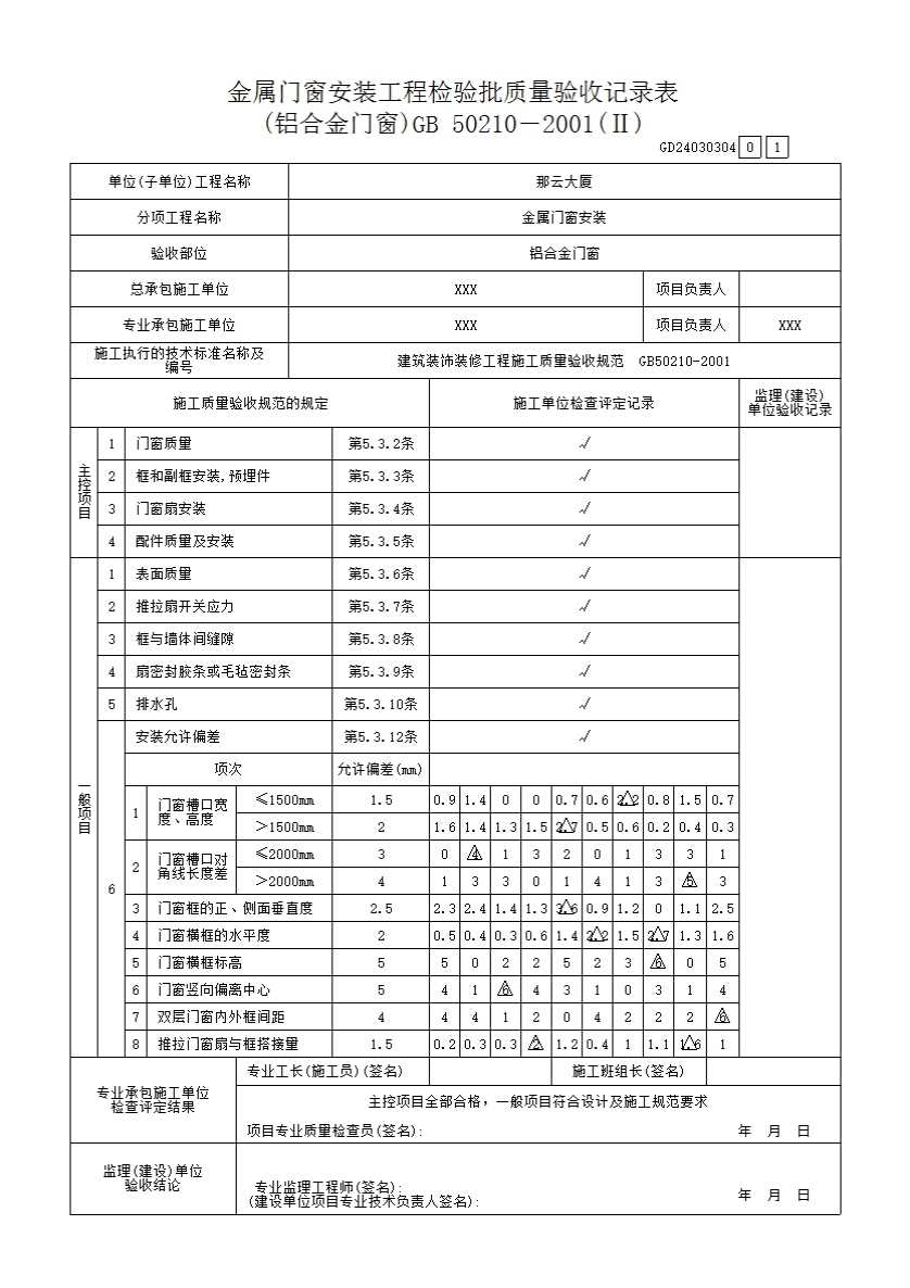 金属门窗安装工程检验批质量验收记录表(铝合金门窗)(Ⅱ)GD24030304