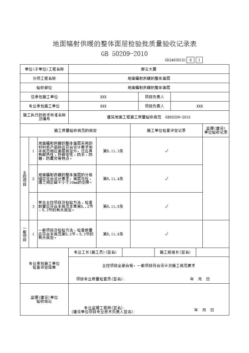 表格名称:地面辐射供暖的整体面层检验批质量验收记录表GD24030121