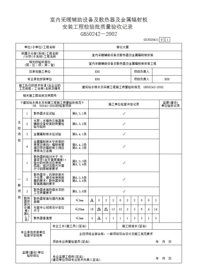 室内采暖辅助设备及散热器及金属辐射板安装工程检验批质量验收记录GD3020411