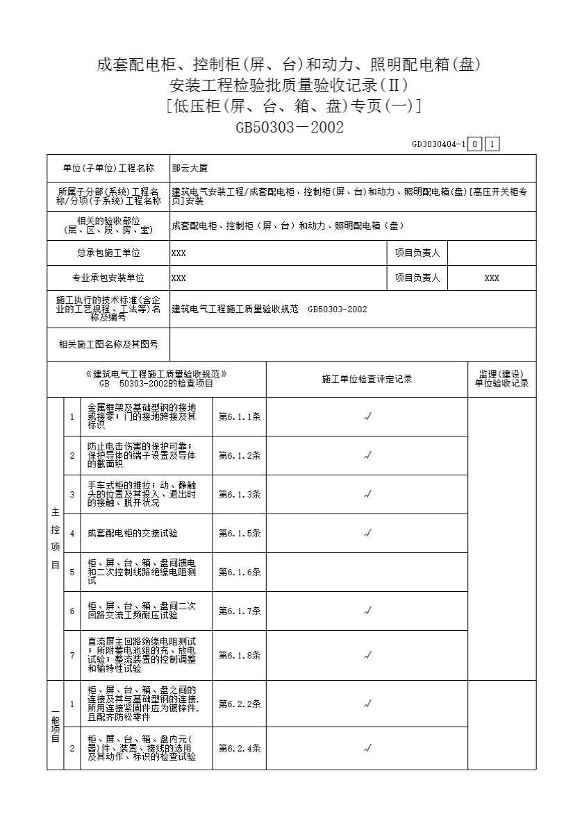 成套配电柜、控制柜(屏、台)和动力、照明配电箱(盘)[高压开关柜专页]安装检验批质量验收记录(一)~(二)GD3030403