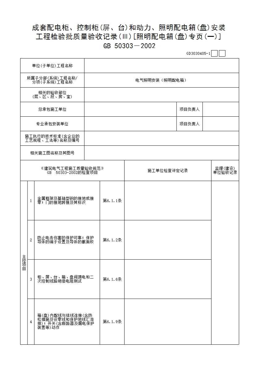 成套配电柜、控制柜(屏、台)和动力、照明配电箱(盘)安装检验批质量验收记录