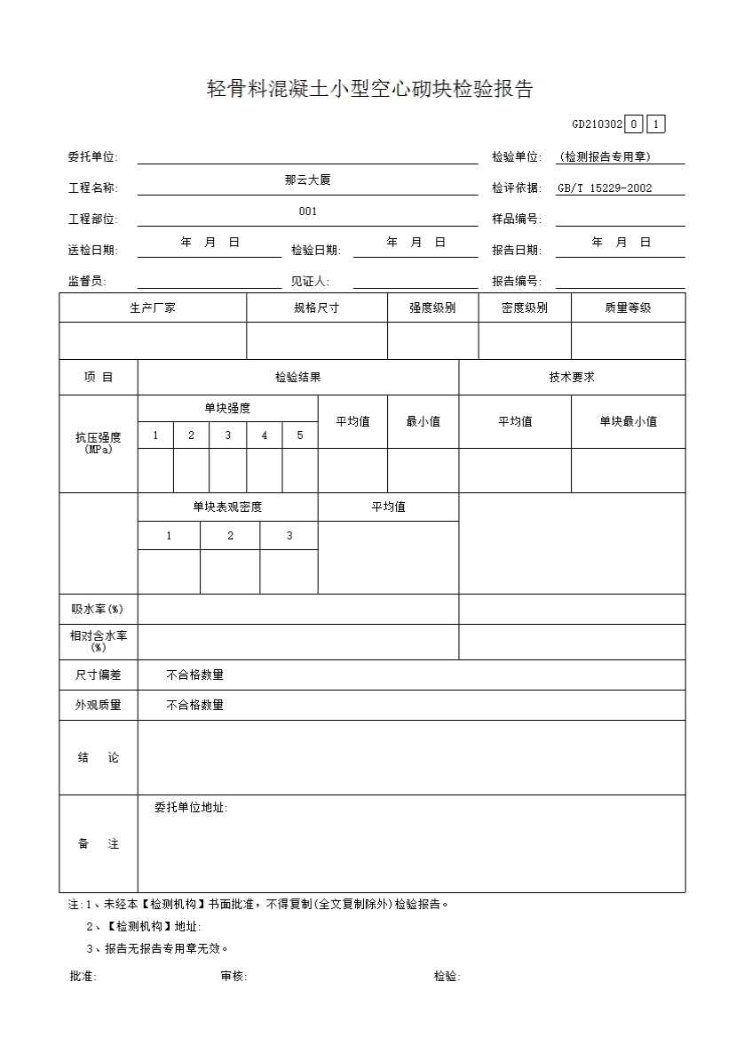 表格名称:轻骨料混凝土小型空心砌块检验报告GD210302