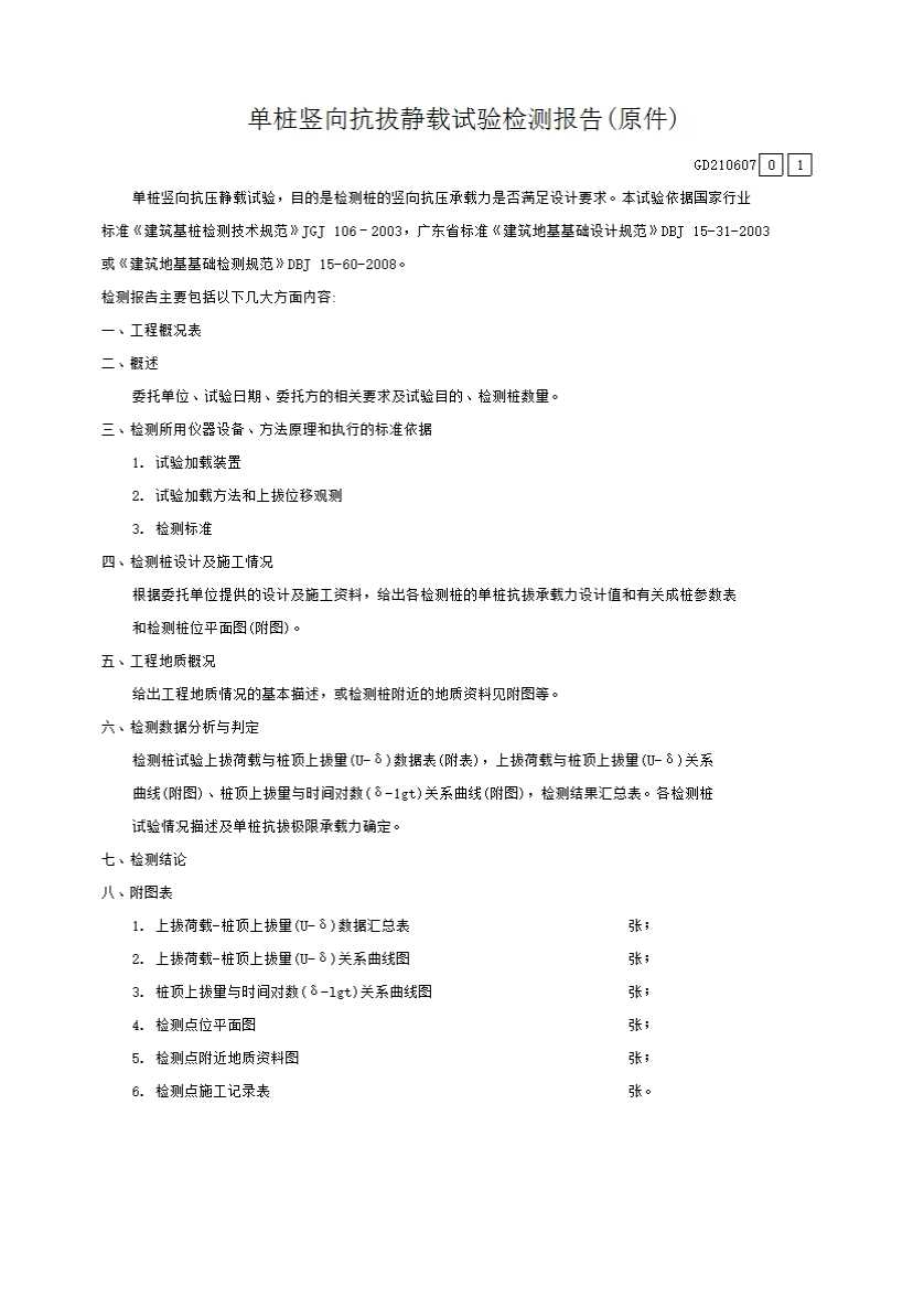 表格名称:单桩竖向抗拔静载试验检测报告(原件)GD210607