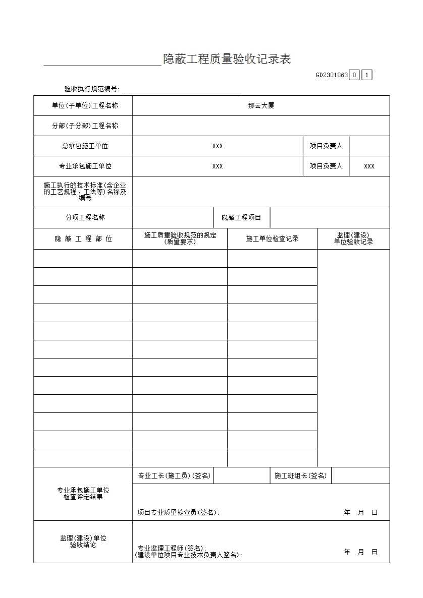 表格名称:____隐蔽工程质量验收记录表GD2301063