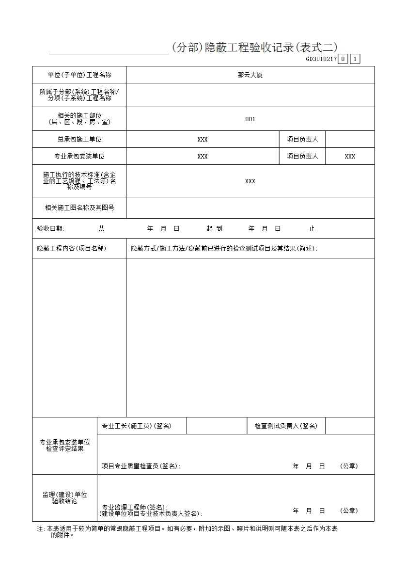 表格名称:(分部)隐蔽工程验收记录(表式二)GD3010217