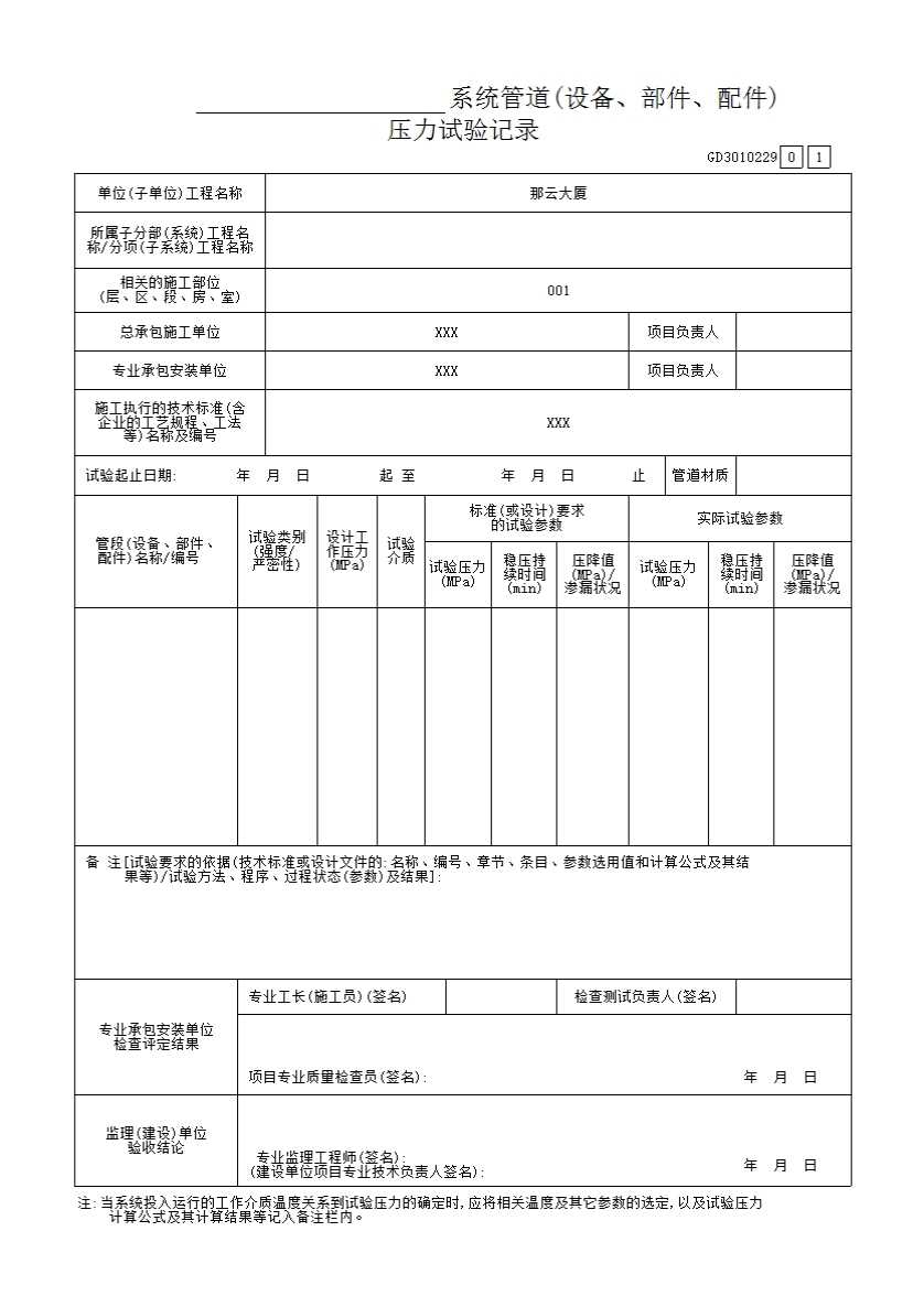 系统管道(设备、部件、配件)压力试验记录GD3010229
