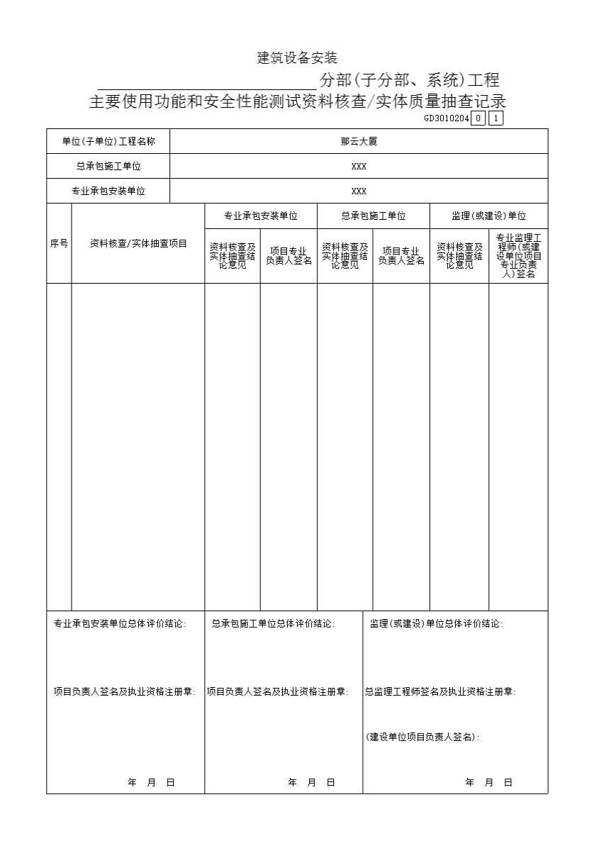 表格名称:建筑设备安装______分部(子分部、系统)工程主要使用功能和安全性能测试资料核查/实体质量抽查记录GD3010204