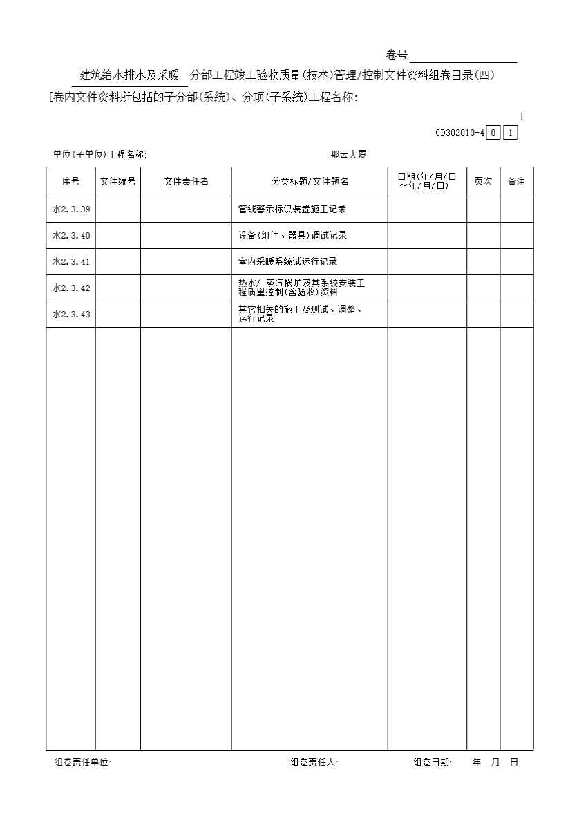 建筑给水排水及采暖分部工程竣工验收质量(技术)管理/控制文件资料组卷目录(四)GD3020101