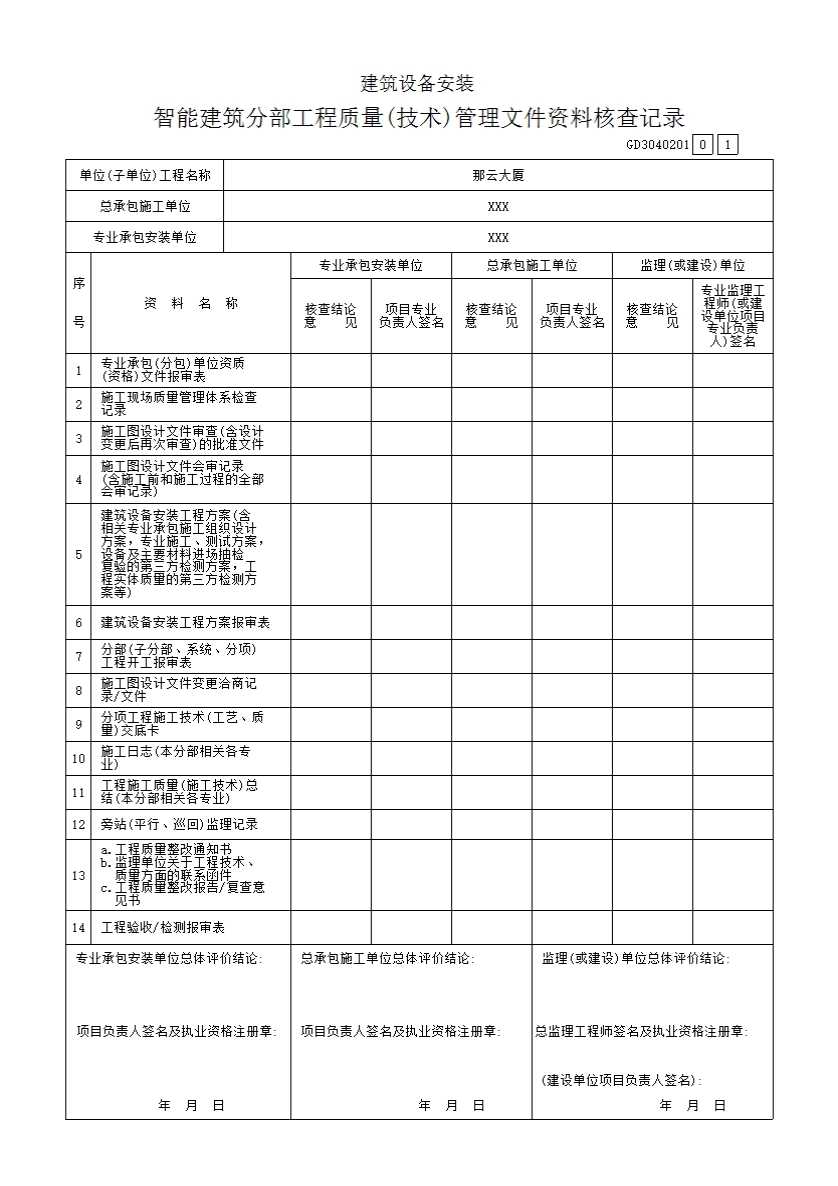 建筑设备安装智能建筑分部工程质量(技术)管理文件资料核查记录GD3040201