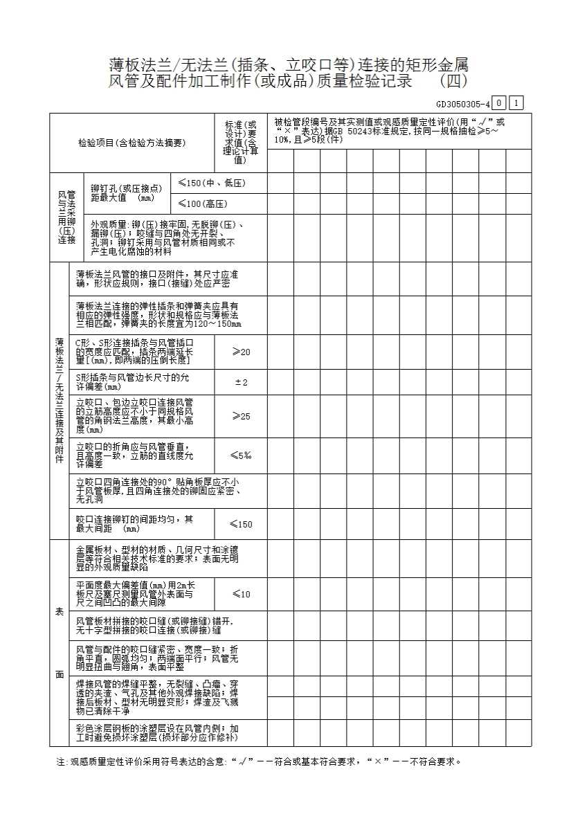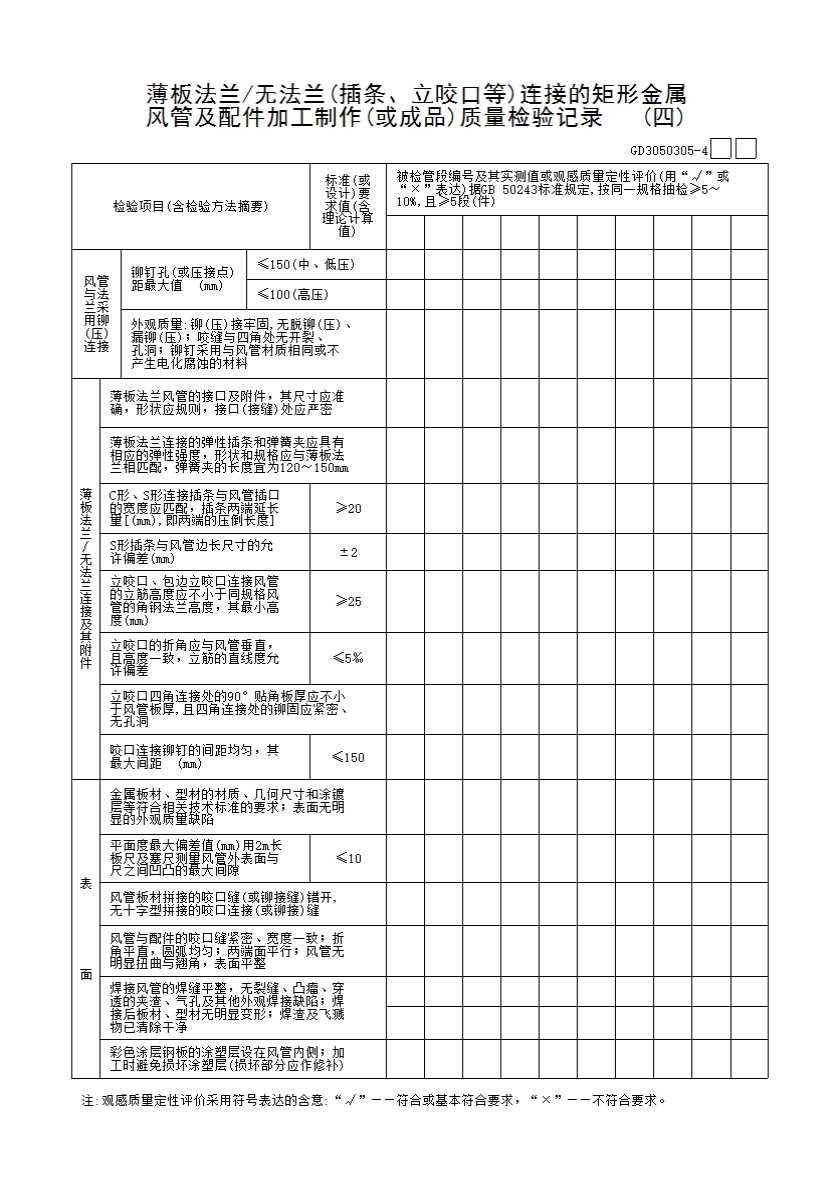 表格名称:薄板法兰无法兰(插条、立咬口等)连接的矩形金属风管及配件加工制作(或成品)质量检验记录(四)GD3050305