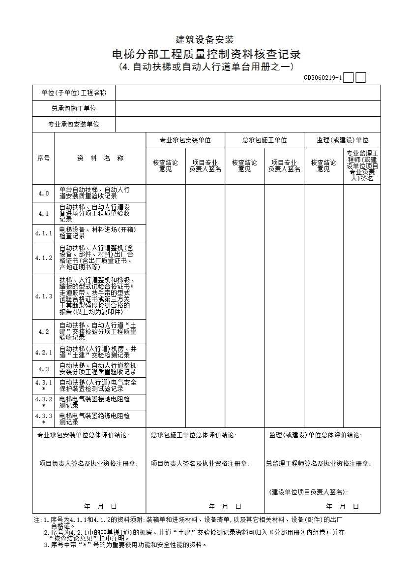 表格名称:建筑设备安装电梯分部工程质量控制资料核查记录(自动扶梯或自动人行道单台用册之一)GD3060219