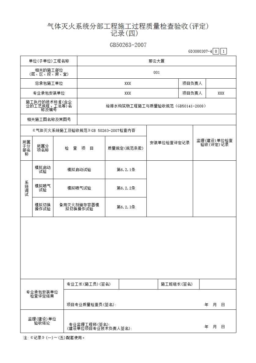 表格名称:气体灭火系统分部工程施工过程质量检查验收(评定)记录 (四)GD3080307