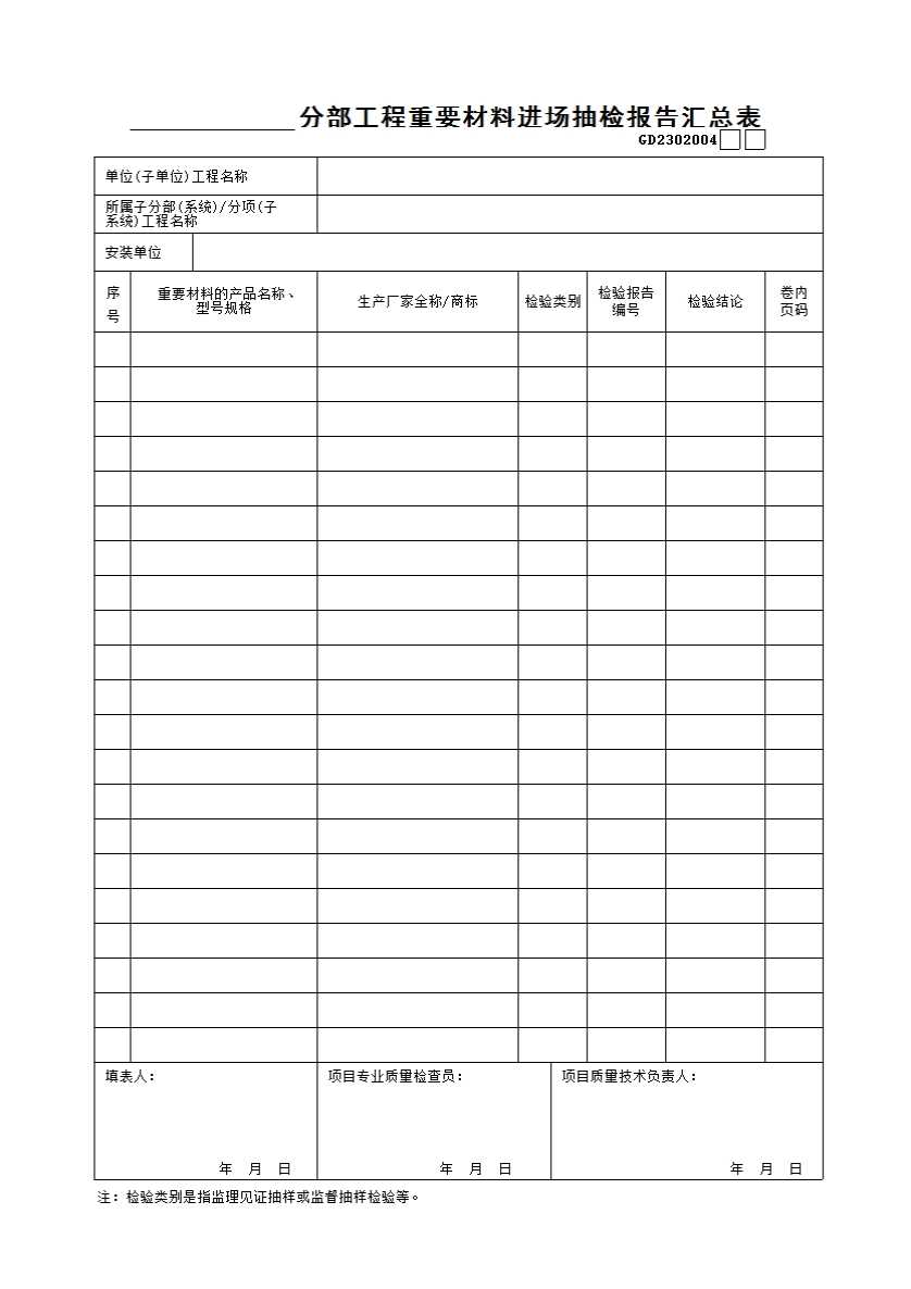 表格名称:4.安装工程重要材料进场抽检报告汇总表GD2302004