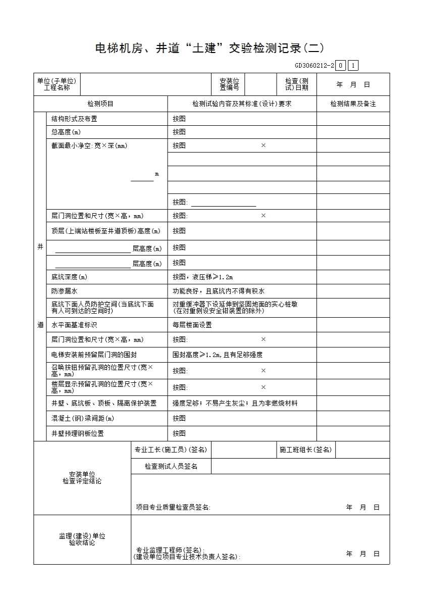 表格名称:电梯机房、井道“土建”交验检测记录(二)GD3060212